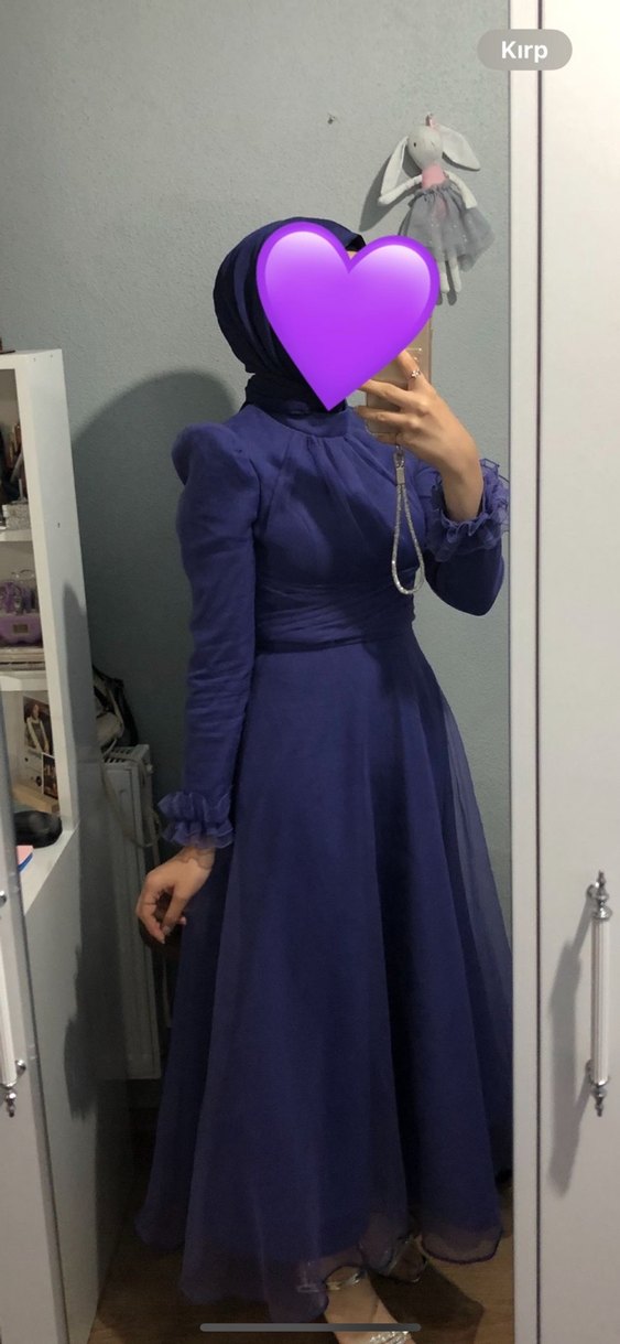 Uzun, fitted mor abiye elbise yüksek yakalı ve uzun kolludur, kollarında ince fırfır detayları vardır. Drapeli tasarımı ile mütevazı ve gotik tarzlara uygundur.