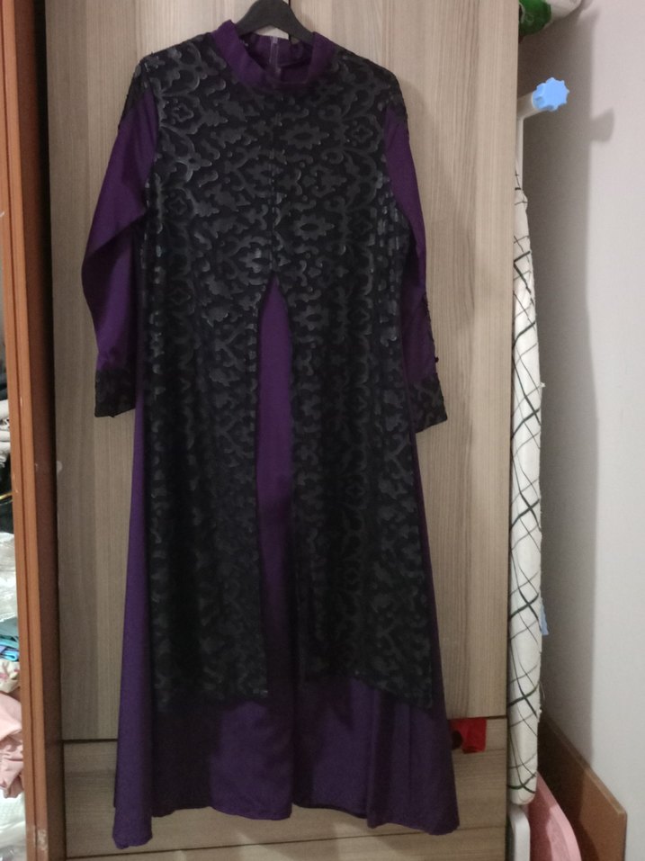 Uzun mor elbise, yüksek yakalı ve uzun kolludur. Sentetik kumaştan, koyu desenli ve dökümlü katmanlıdır. Modest gotik stile uygundur.