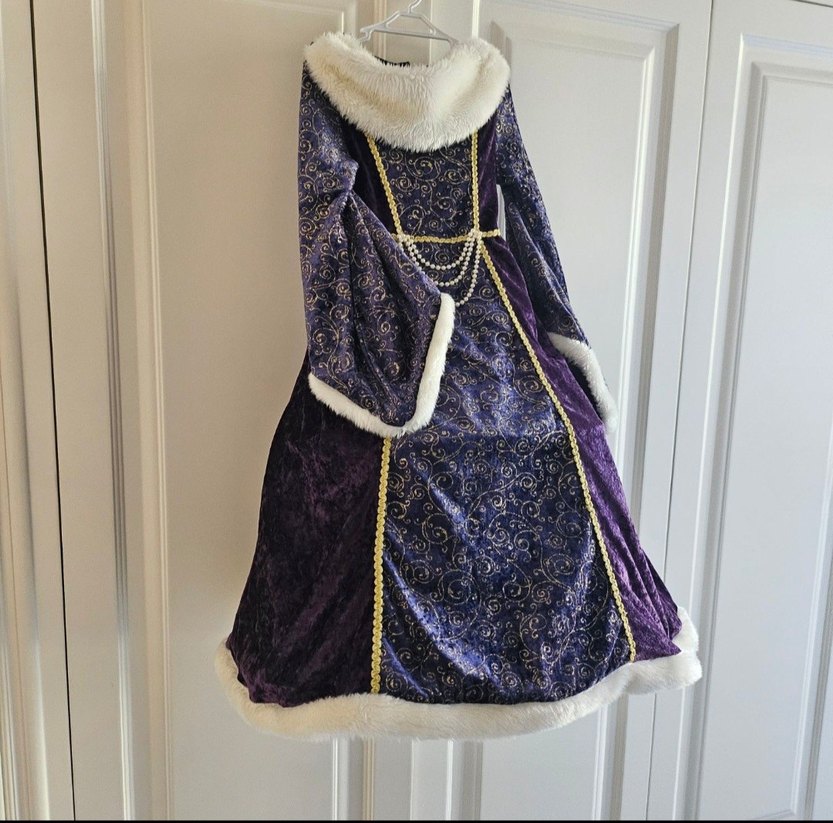 Anna kostümü orjinal urundur Uzun mor, parlak desenli kumaştan, uzun kollu, beyaz kürk detaylı, gotik tarzda, ince kesim, inci zincir süslemeli. sırt fotografini yakinlastirirsaniz cırt cırt kendi etrafında ufak yüklenme yapmis