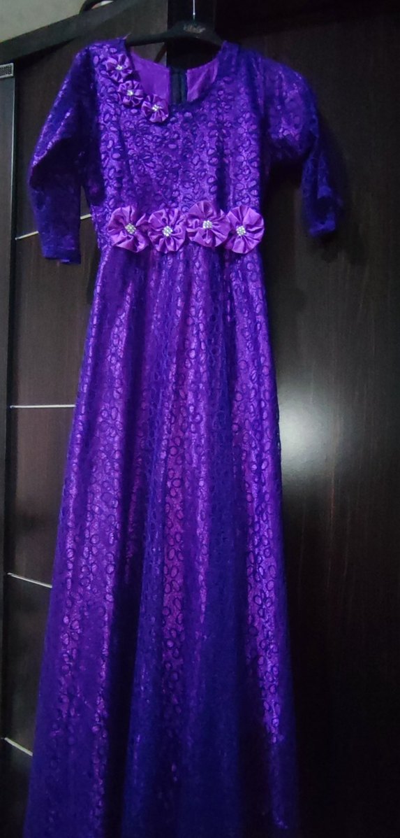 Uzun, mor renkli bu abiye elbise, uzun kollu ve kayık yakalıdır. Drapeli tasarımı, renkli batik deseni ve belde çiçek detayları ile gotik düğün stiline uygundur.