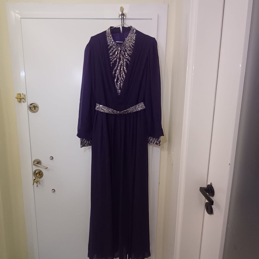 Uzun mor renkli, yüksek yakalı ve uzun kollu, dökümlü ve bol kesimli gotik tarzda kadın abiye elbise. Düğünler için uygundur.