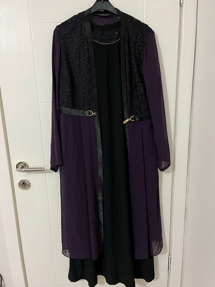 Uzun, bol kesim kadın elbisesi, drapeli ve kesik yaka detaylıdır. Uzun kollu, ipeksi kumaştan, koyu mor renkte, gotik tarzda ofis kullanımı için uygundur.
