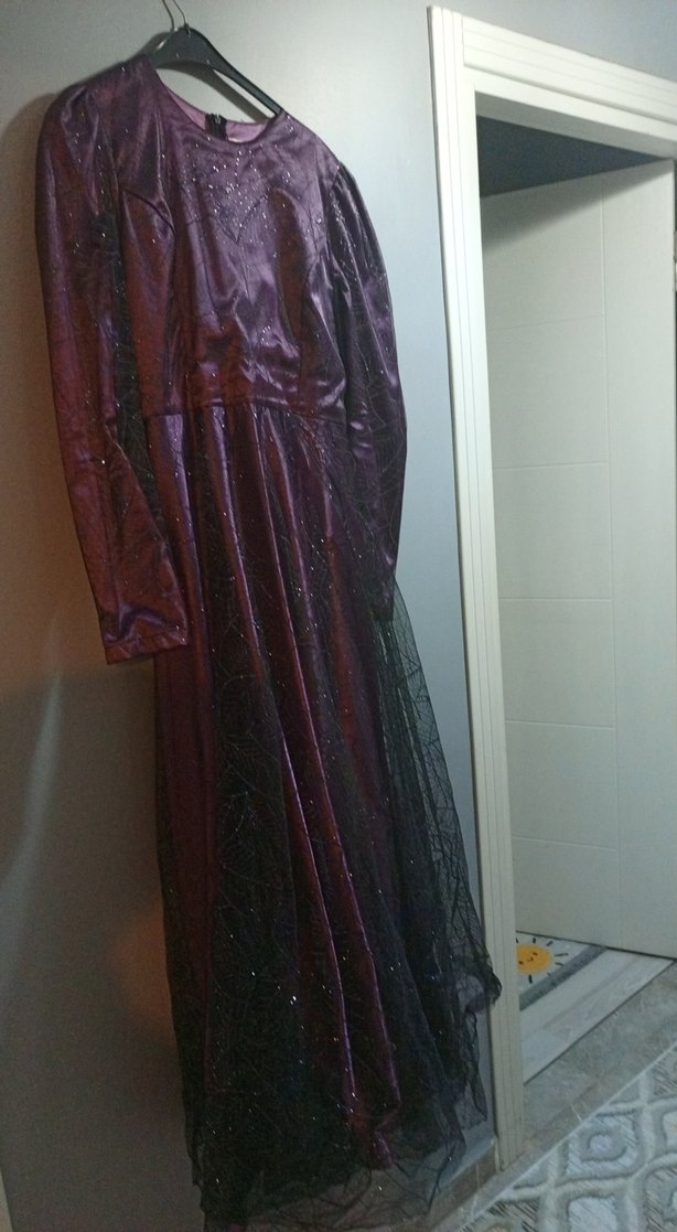 Uzun, koyu mor renkte gotik tarzda, drapeli, uzun kollu ve yüksek yakalı bol kesim kadın elbisesi. Düğün için uygundur. ✨