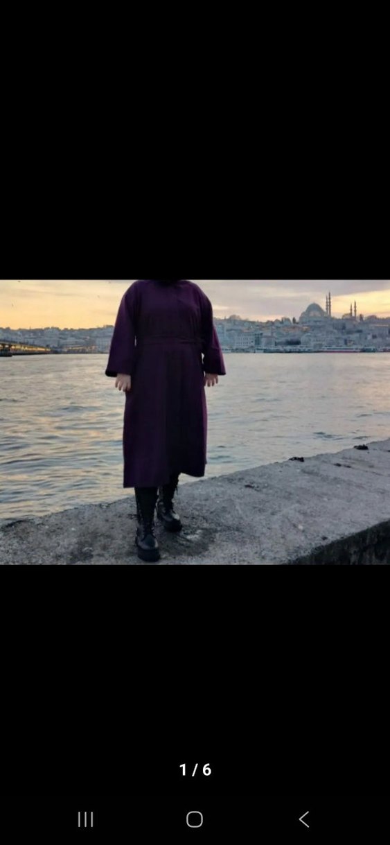 Yüksek yakalı, uzun kollu ve bol kesimli bu uzun mor kaban , yumuşak ve sıcak kumaştan yapılmıştır. Drapeli tasarımıyla mütevazı giyime uygundur.