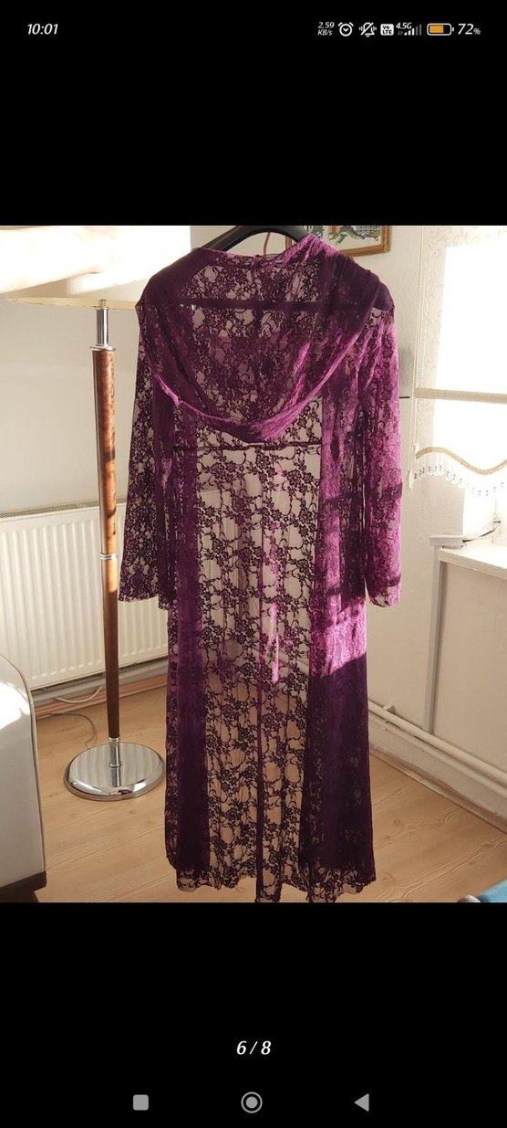 Uzun mor renkte, uzun kollu ve bol kesim gotik tarzda dantel kumaştan yapılmış kadın sabahlık.