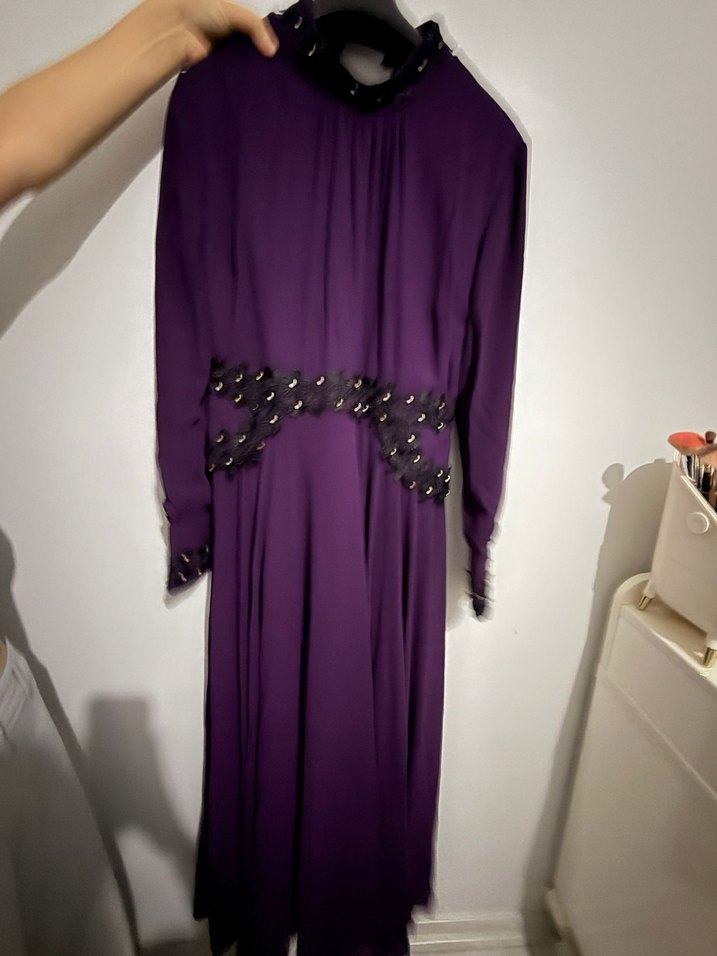 Uzun kollu, yüksek yakalı ve kemerli bel detaylı, nakış işlemeli mor uzun elbise, romantik akşamlar için uygundur.
