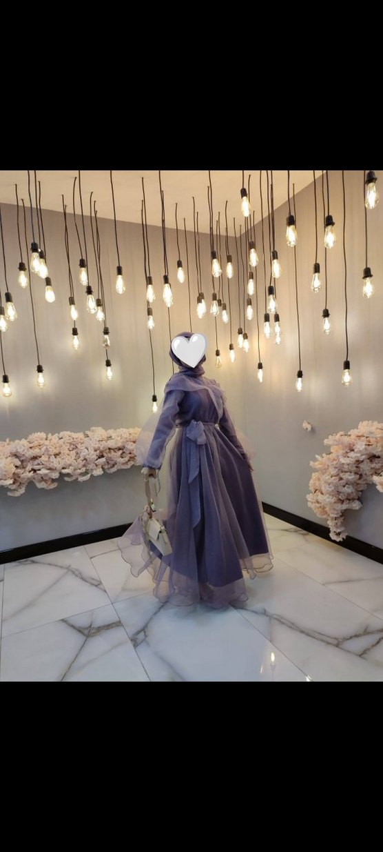 Uzun mor renkte, yüksek yakalı ve askılı kollu, drapeli tasarıma sahip abiye elbise. Düzenli kesim ve avant-garde tarzda, düğün için uygundur. 1 kez giyildi