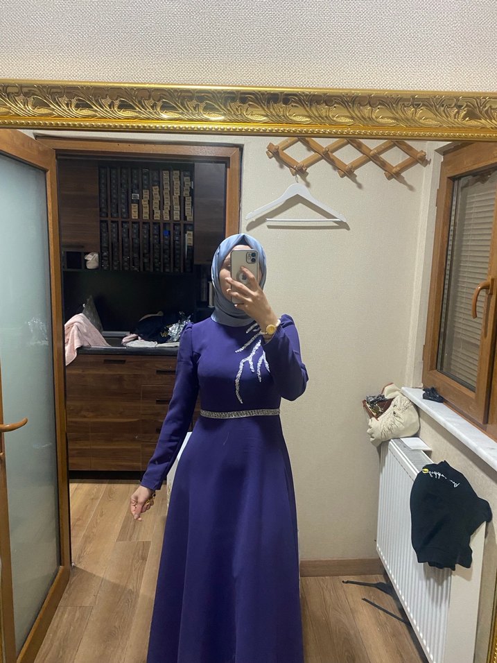 Uzun mor elbise, yüksek yakalı ve uzun kollu, drapeli tasarımla sade ve gotik stil sunar. Günlük kullanıma uygundur.