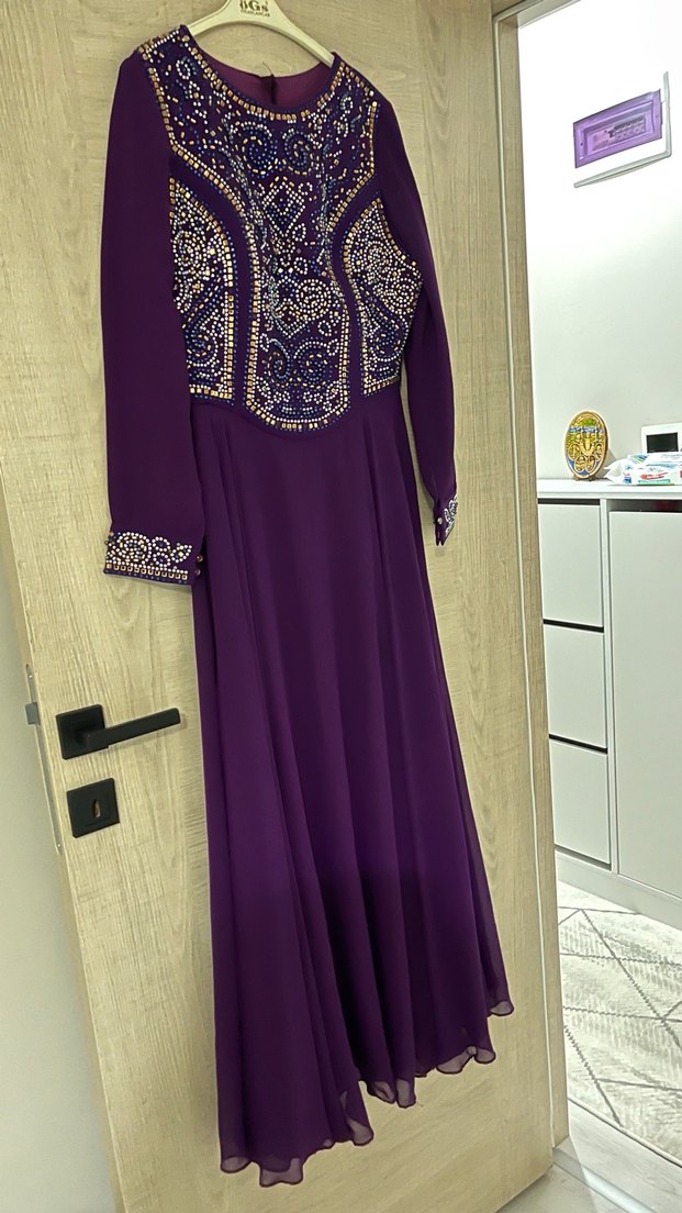 Uzun Mor İşlemeli Boncuklu Kadın Elbise