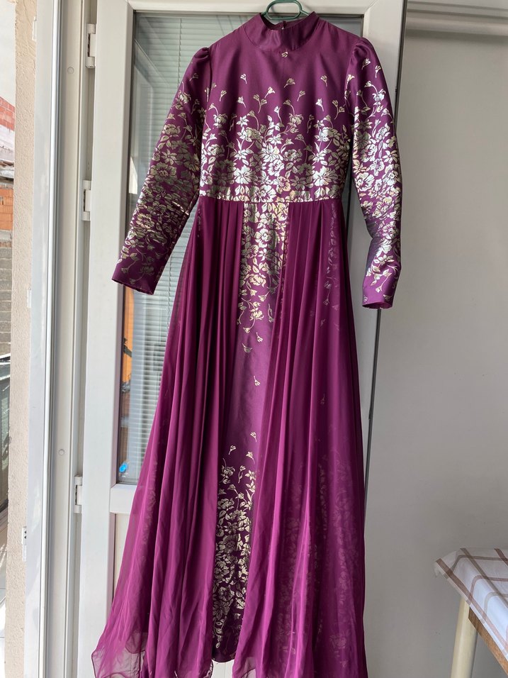 Uzun, bol kesim kadın abiye elbise, yüksek yakalı ve uzun kolludur. Parlak işlemeli çiçek desenleriyle süslenmiş, drapeli ve mütevazı bohem tarzındadır.