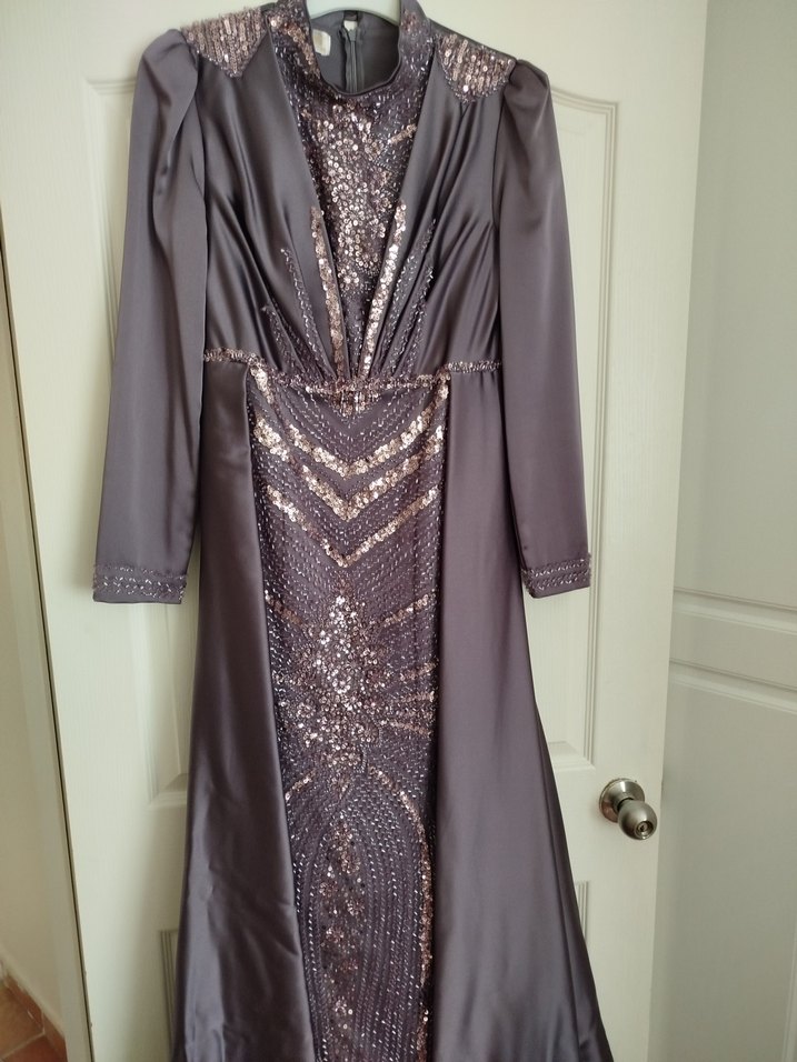 Bu uzun, dar kesim abiye elbise, işlemeli parlak mor kumaş ve şal yaka yakaya sahiptir. Uzun kollu ve düğünler için uygundur. 2 kere giyindim sadece, herhangi bir defosu yok boyum 175 ve 8 cm topukluyla giyebiliyorum rahatlıkla. Şalıyla birlikte göndereceğim. 38-40 bedene sahip olanlara gayet güzel olur