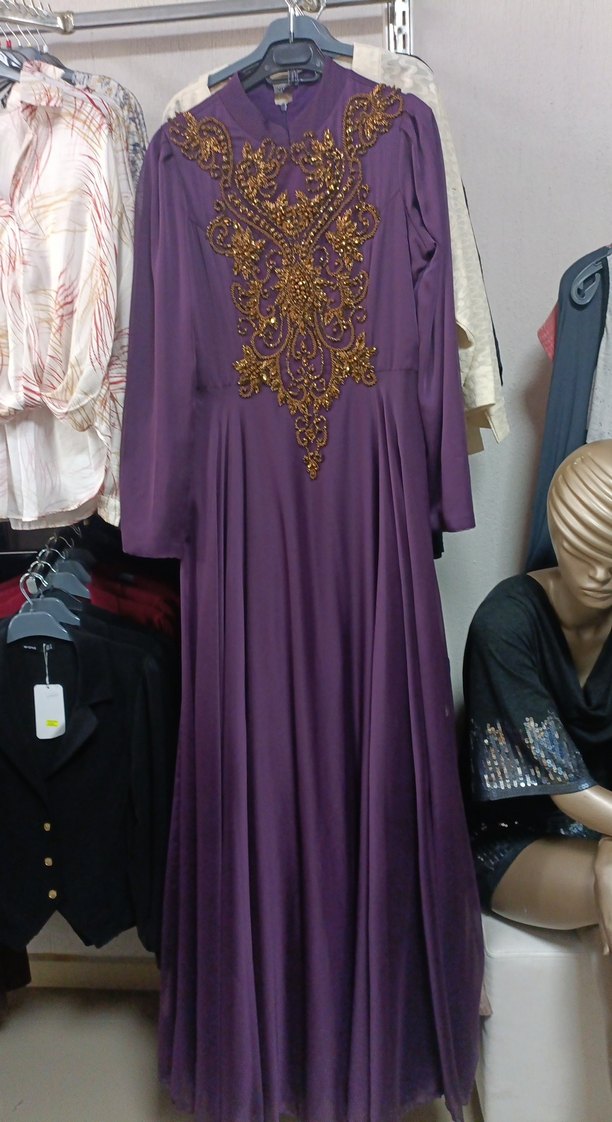Bu uzun mor elbise, bol kesim ve drapeli kumaş ile ön kısmında detaylı işlemelere sahiptir. Yuvarlak yaka ve uzun kolludur, mütevazı ve bohem tarzlar için uygundur.