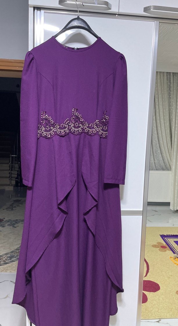 Uzun kollu, yüksek yakalı mor elbise, bel kısmında işlemeli detaylar ve drapeli tasarıma sahip, bol kesimdir. Düğünler için uygundur.