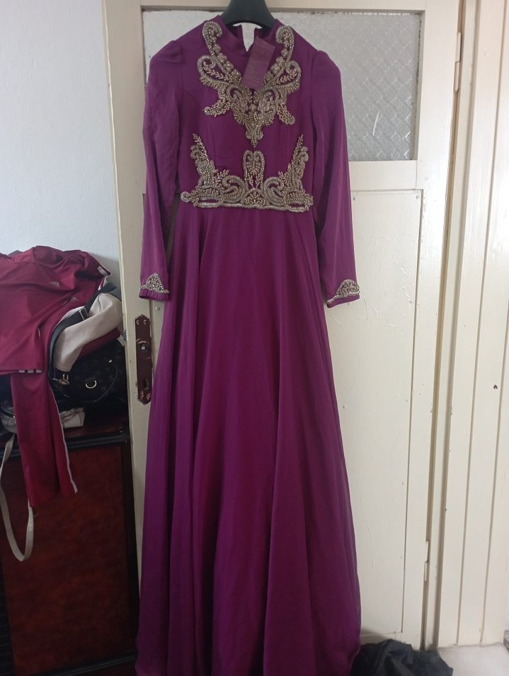 Uzun mor elbise, bol kesim ve drapeli kumaş ile işlemeli detaylara sahiptir. Uzun kollu ve V yakalı, düğün için uygundur.