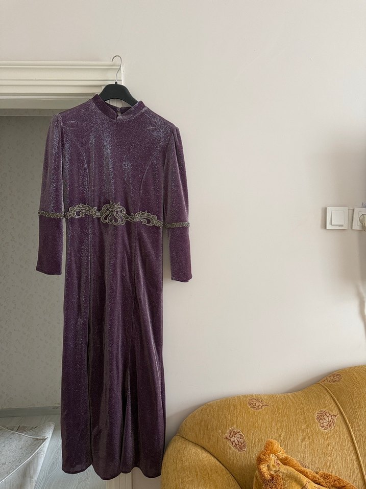 Yüksek yakalı, uzun kollu ve işlemeli detaylara sahip, mor renkli, vintage ve bohem tarzda uzun, vücuda oturan abiye elbise. Düğünler için uygundur.