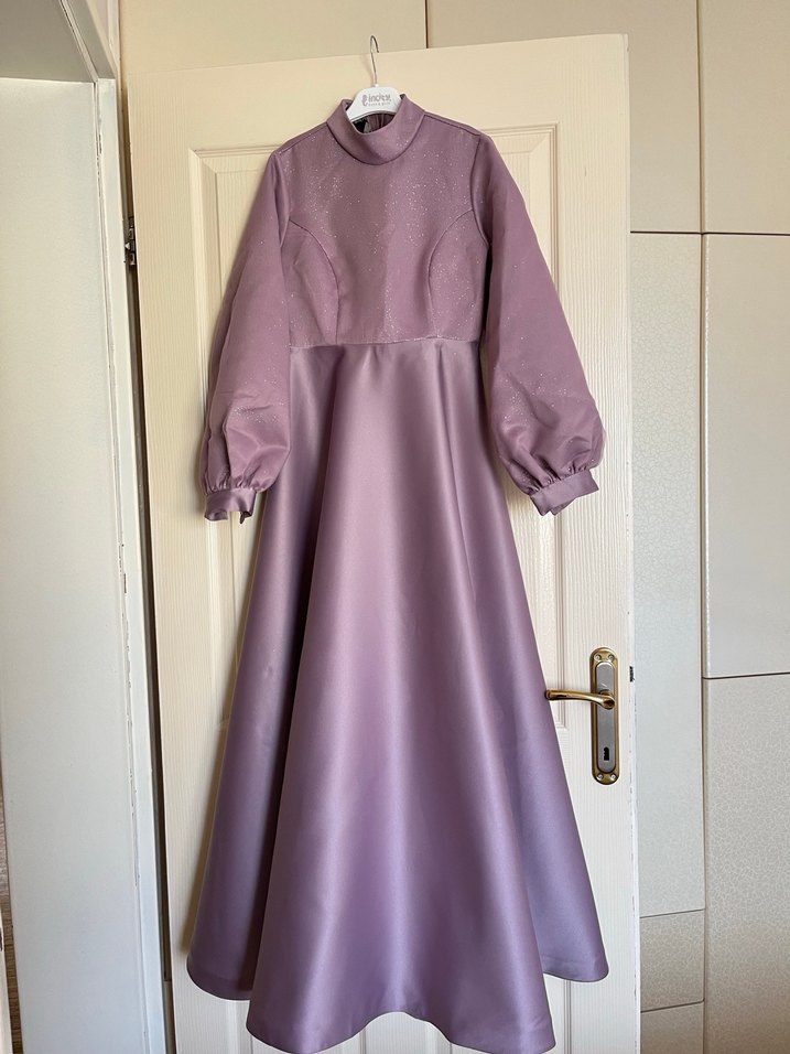 Yüksek yakalı, uzun kollu ve dökümlü tasarıma sahip uzun mor abiye elbise. Parlak ve desensiz kumaşıyla modern klasik ve vintage şıklığını birleştirir.