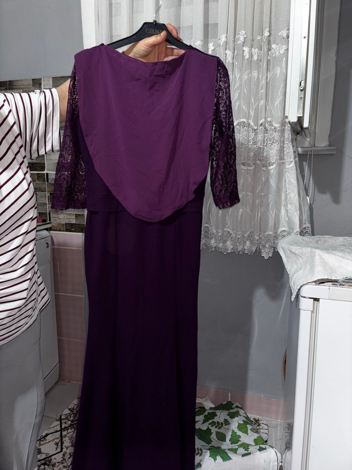 Tanesi 100 tlden verilecek Uzun, mor renkte, v yaka ve dantelli uzun kollu, drapeli, klasik şıklıkta gotik tarzda kadın abiye elbise. Düğünler için uygun.