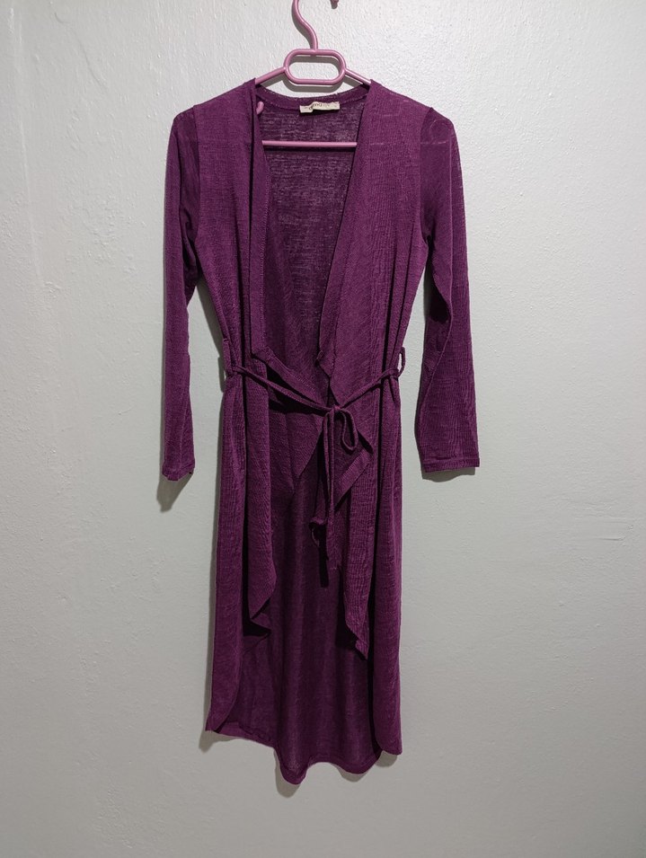 Uzun mor renkte, bol kesim ve uzun kollu, bağcıklı minimalist bohem tarzda desen içermeyen kadın sabahlığıdır.