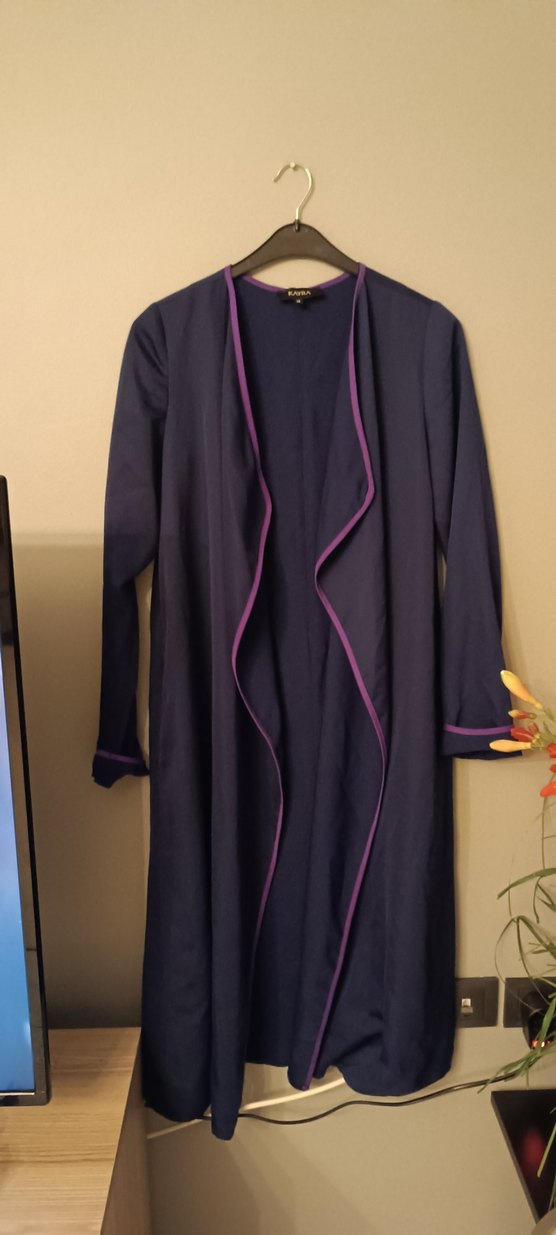 Uzun mor renkte, regular fit ve uzun kollu, desen içermeyen, avangart tarzda bir kadın dış giyim solma yırtık vs yok temiz ürün