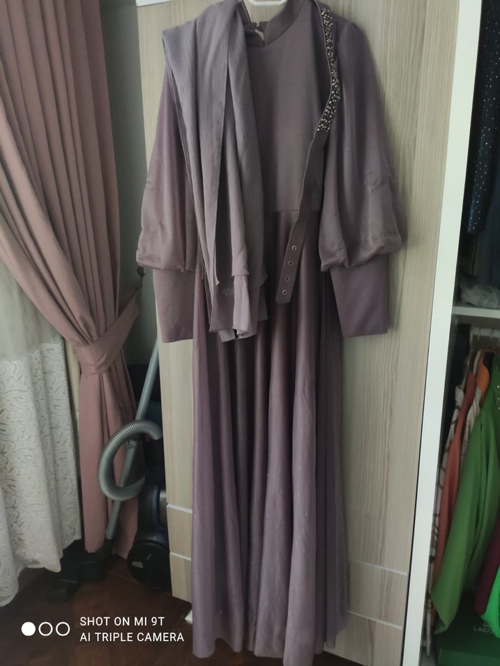 Uzun, bol kesim, desensiz mor kadın elbisesi, ince askılı kollara sahip ve minimal tarzda.