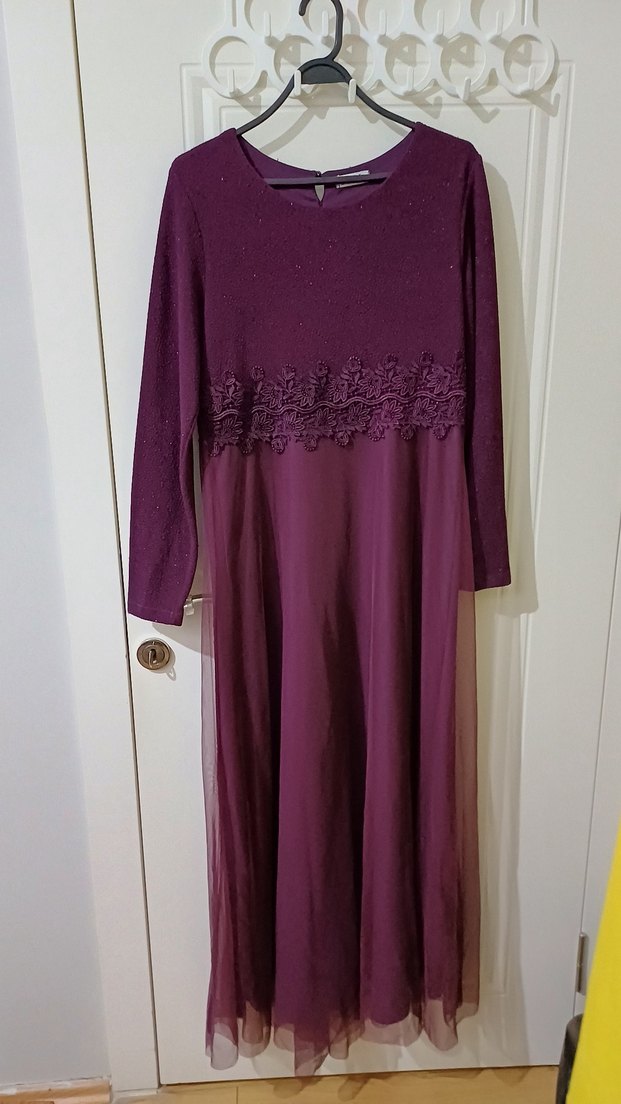 Uzun, bol kesim kadın elbisesi uzun kollu ve yuvarlak yakalıdır. İki koltuk arası mesafe 48 cm uzunluğu 145 cm dir. Tül kısmında ufak bir delik vardır.