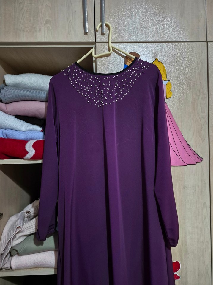 Uzun mor renkli, drapeli ve uzun kollu kadın elbisesi. Salaş kesimi ve yuvarlak yaka detayıyla sade ve günlük kullanıma uygun bir modeldir.