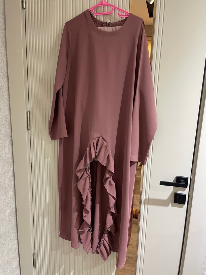 Uzun mor elbise, bol kesim ve uzun kolludur. Minimalist tasarımda fırfır detayları ve yumuşak sentetik kumaş kullanılmıştır. Günlük kullanım için uygundur.