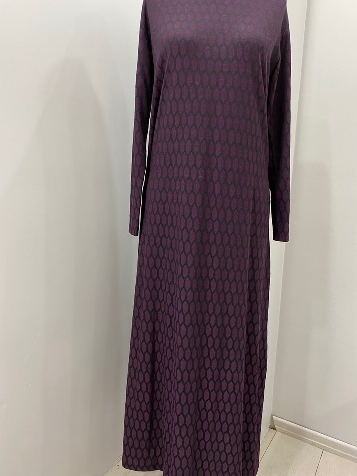Uzun kollu, bisiklet yaka, mor renkli, örgü görünümlü sentetik kumaştan yapılmış, yılan deseniyle ofise uygun uzun elbise.