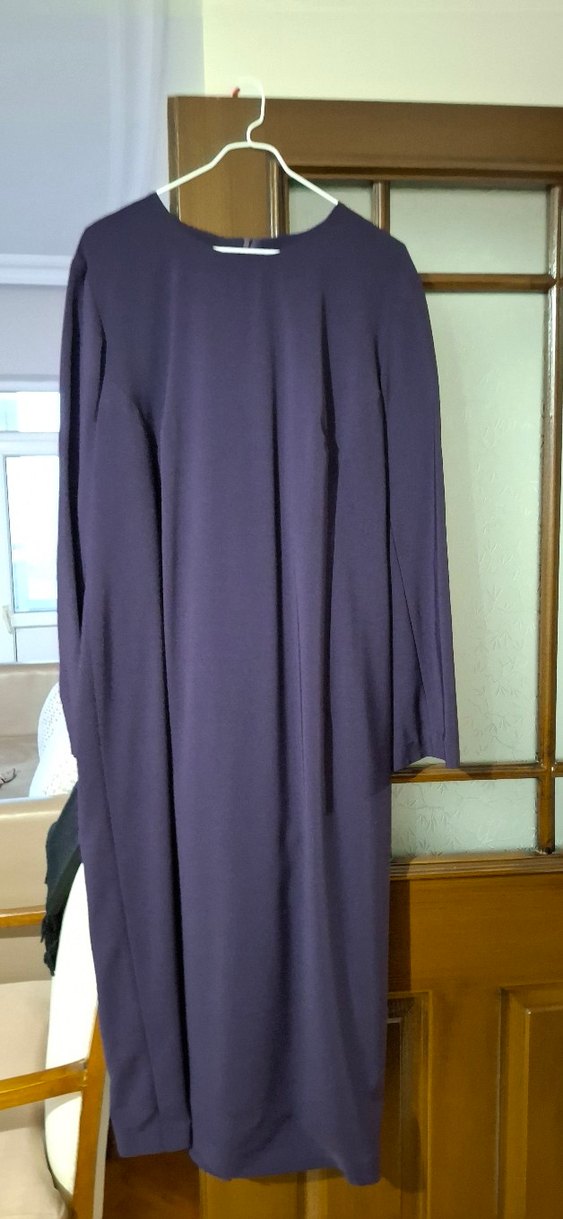 Uzun mor renkte, salaş kesim ve drapeli kadın elbise. Uzun kollu ve yuvarlak yaka, sentetik kumaştan ofis stiline uygun minimal ve sade tasarım. 46/48 arası