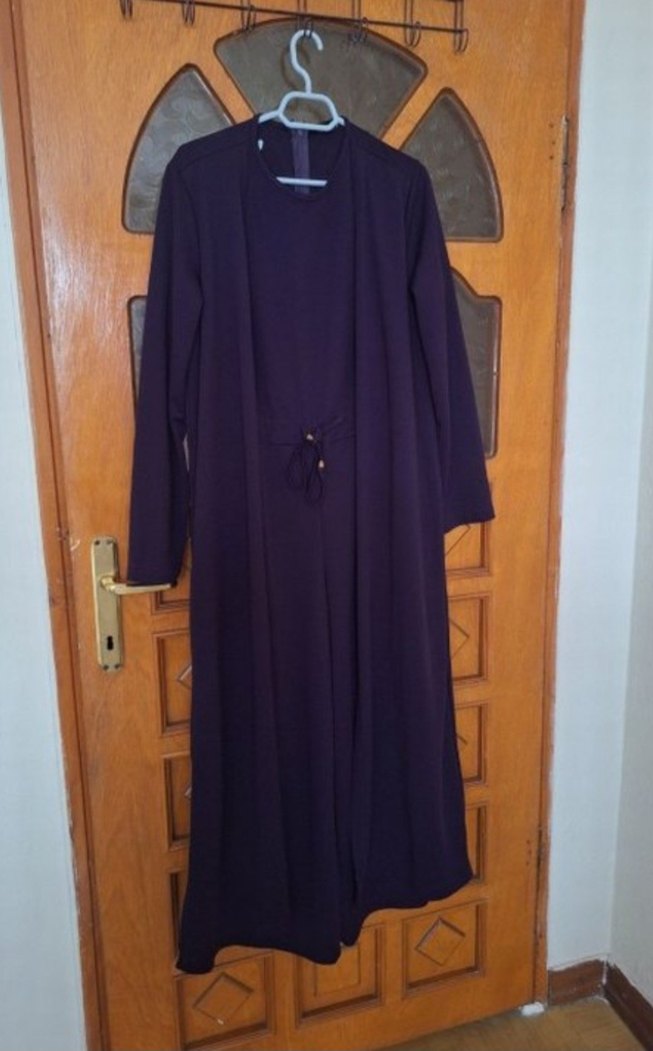Uzun mor elbise, notalı yaka ve uzun kollu. Sade, dökümlü ve modest kesimle günlük kullanım için uygun gotik tarzda. Yumuşak ve sıcak kumaş hissi verir.
