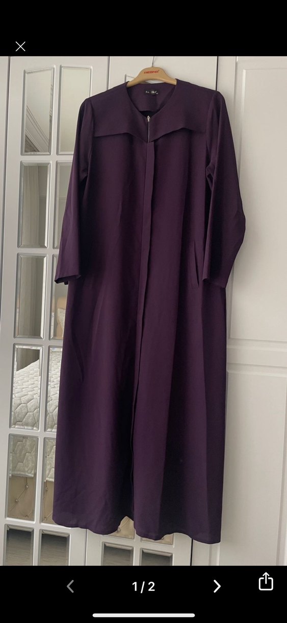 Uzun, mor renkte, bol kesim ve uzun kollu kadın ferace. Ürün sadece 1 defa giyildi. Hiçbir defosu yoktur.