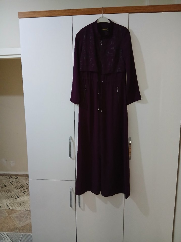 Uzun, gevşek kesimli mor kadın giyimi, uzun kollu ve desensiz, gotik stile uygun.