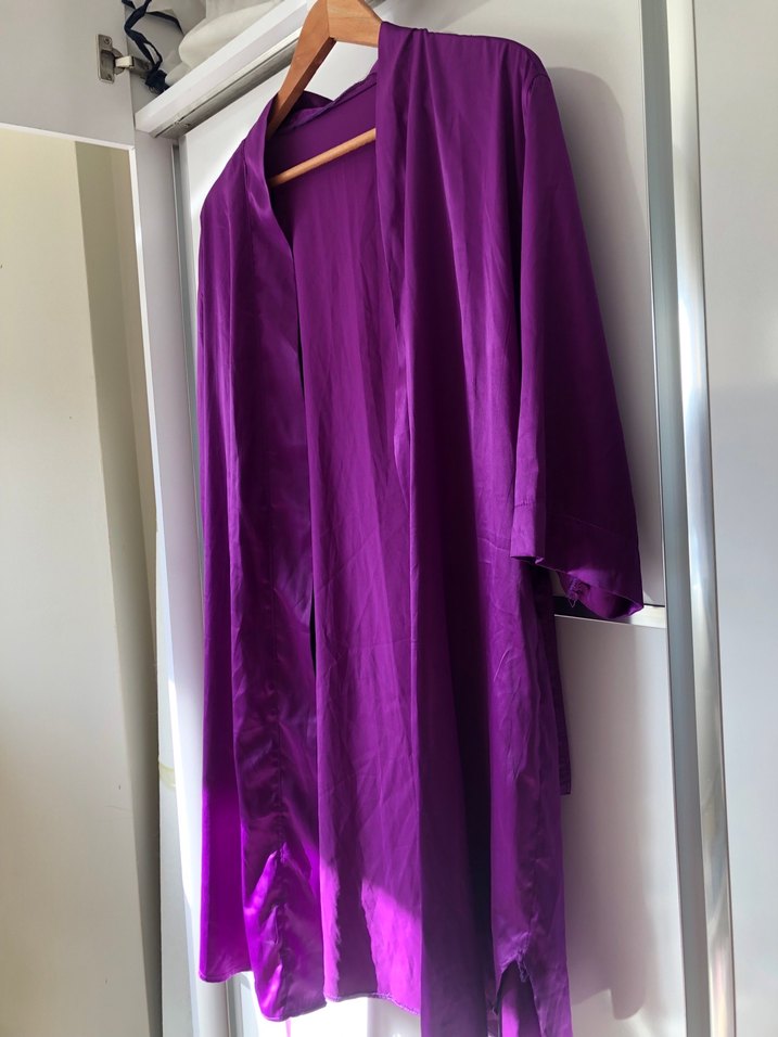 Uzun, parlak mor renkte, bol kesim ve uzun kollu minimal bohem tarzda kadın kimonosu. ✨sabahlık m beden