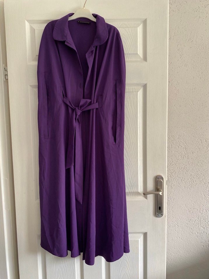 Uzun, kolsuz mor giyisi, bol kesim ve belde kuşaklıdır.