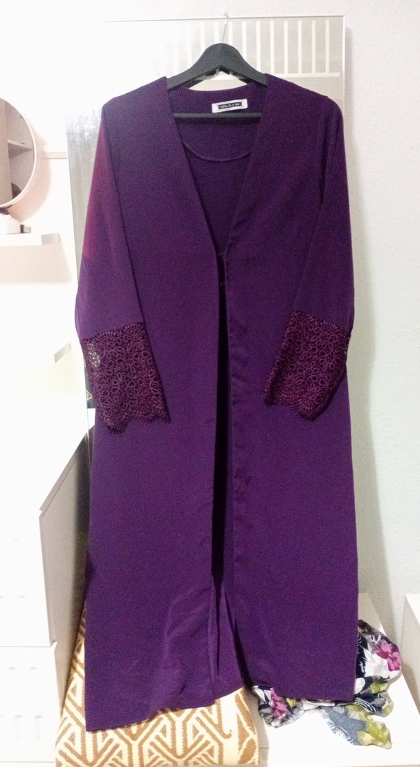 Uzun kollu, regular fit uzun mor sabahlık, manşetlerinde dantel detaylı. Minimalist ve normcore tarzda koyu mor renk.