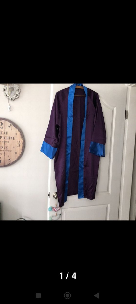 Uzun mor sabahlık, regular kesim ve uzun kolludur. Kenarlarında ve manşetlerinde mavi detaylar bulunur. Desensizdir, üzerinde "PICHINE, EAU" yazısı vardır. 60*119 cm kol boyu 75 cm tertemiz hiçbir sorunu yok