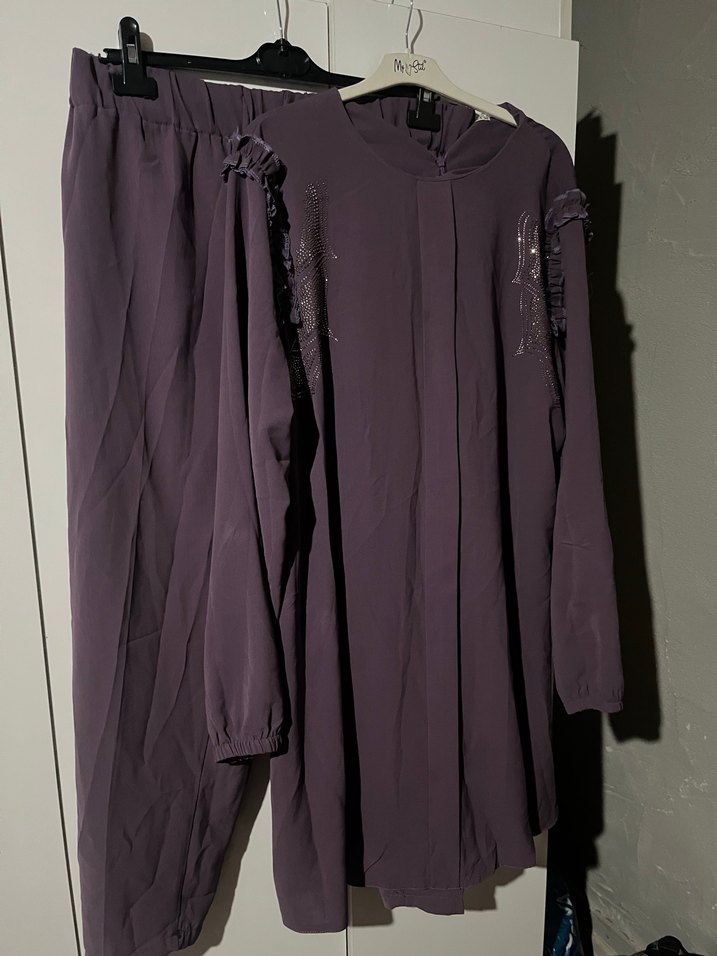 Uzun, salaş kesim mor kadın tunik, uzun kollu ve yakası kesik yakalıdır. Yumuşak sentetik kumaştan, drapeli tasarıma sahiptir. İkili takımdır 90 kiloya kadar olur