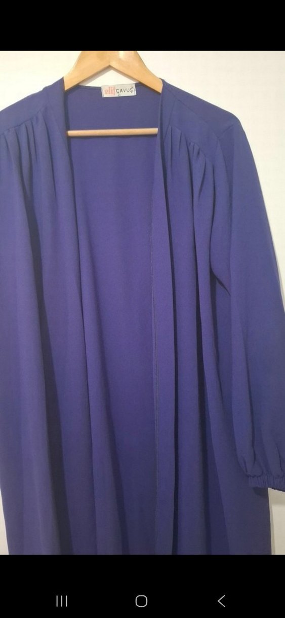 Uzun, bol kesim kadın takım uzun kollu, kızları lastikli, minimalist gotik tarzda koyu mor renktedir. Desensiz, sade bir görünüme sahiptir.