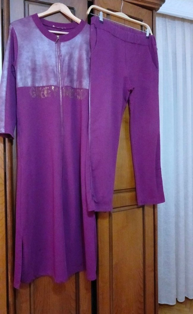 Uzun mor kadın tunik ve pantolon takımı, normal kesim ve uzun kolludur. Tunik, yakası yarım ay yaka ve dökümlü tasarıma sahiptir. Parlak görünümlü, yumuşak sentetik kumaştan üretilmiştir. Minimalist ve mütevazı günlük kullanım için uygundur.