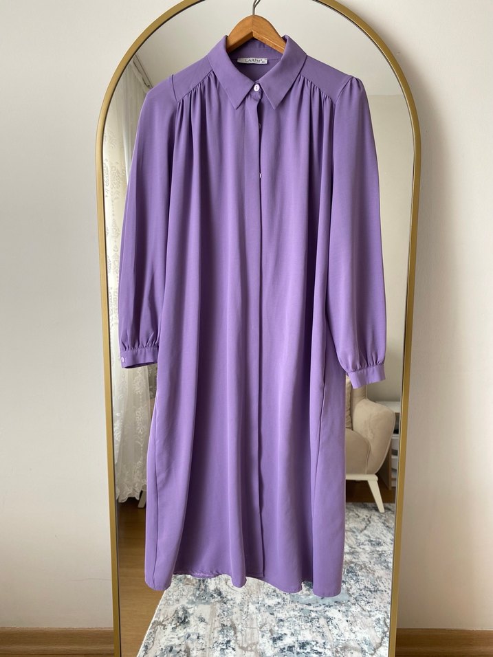 Uzun mor renkte, yakalı ve drapeli tasarıma sahip kadın tunik. İpeksi kumaştan, bol kesim ve uzun kollu, ofis için uygun minimal tarzda.