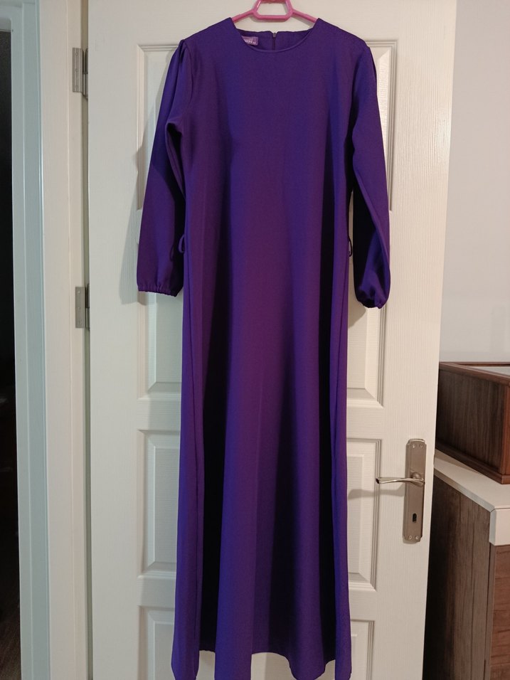 Uzun mor kalem elbise, kesim, uzun kollu ve yuvarlak yaka ile sade ve tesettürlü bir görünüm sunar. İpek gibi kumaşı ve dökümlü tasarımıyla günlük kullanıma uygundur.