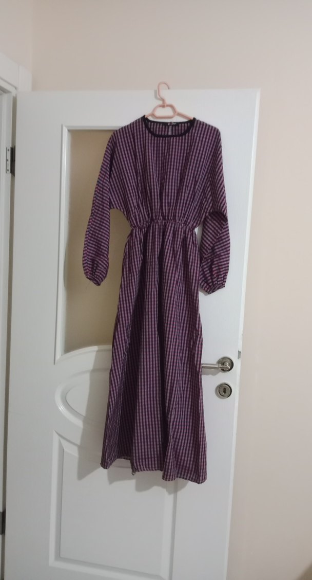 Uzun, mor kareli piliseli elbise, bol kesim ve uzun kollu. Yuvarlak yakalı, günlük kullanıma uygun sentetik kumaştan yapılmıştır.
