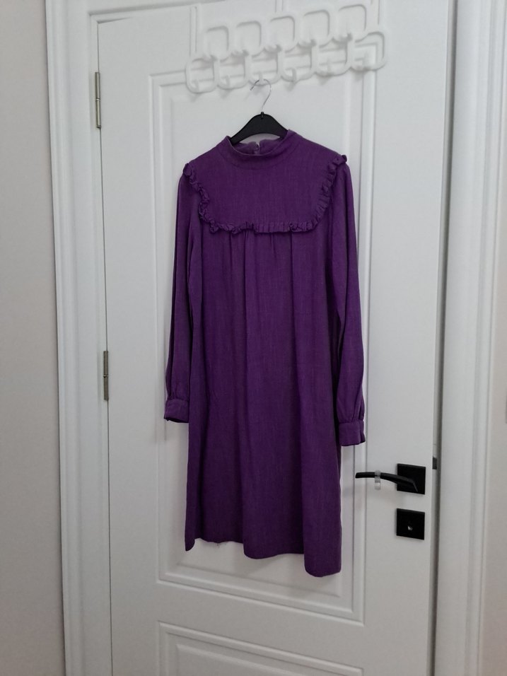 Fırfırlı detaylı, yüksek yakalı uzun mor keten elbise. Uzun kollu ve bol kesim, koyu tonlarda tie-dye deseniyle bohem ve goth tarzına uygun. Boyu 95 cm
