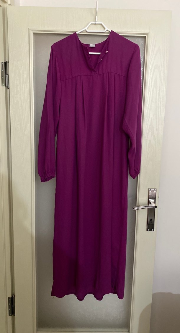 Uzun, mor renk keten kumaştan yapılmış, bol kesim ve drapeli detaylara sahip, uzun kollu ve V yaka minimalist bohem tarzda elbise. Günlük kullanıma uygundur.