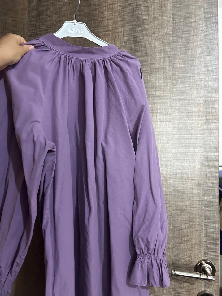 Uzun mor keten kumaştan, bol kesim ve drapeli V yaka tunik. Uzun kolları, büzgülü manşetleriyle günlük kullanıma uygun minimal tarzda.