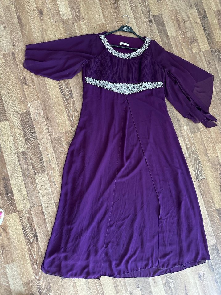 Uzun mor elbise, bol kesim, drapeli uzun kollu ve nakışlı yakalık ile bele sahiptir, düğünler için uygundur. Bir kez giyildi 44 beden uyumludur şifon kumaş astarlı harika şık bir elbise