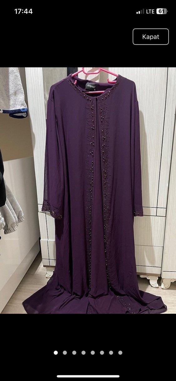 Uzun mor renkli, bol kesim ve uzun kollu bu kadın elbisesi, ön ve manşetlerde detaylı nakış işlemeleri ile bohem tarzını yansıtıyor.