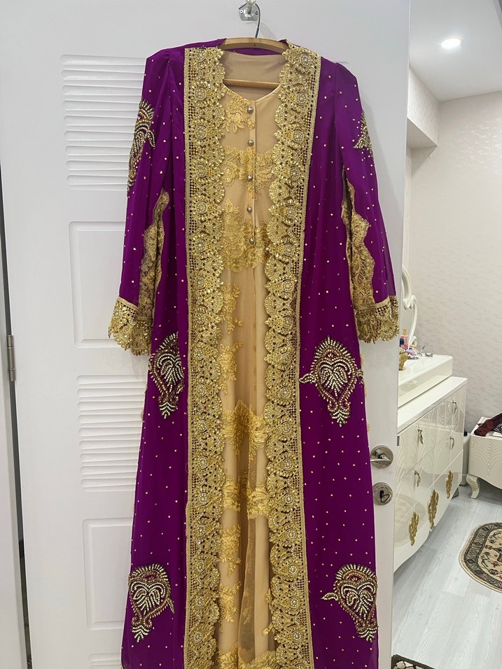 Uzun mor renkli, bol kesim, nakışlı ve drapeli kadın hint elbisesi. Uzun kollu ve yakası kesik yakalı, sade ve şık bir tasarım.