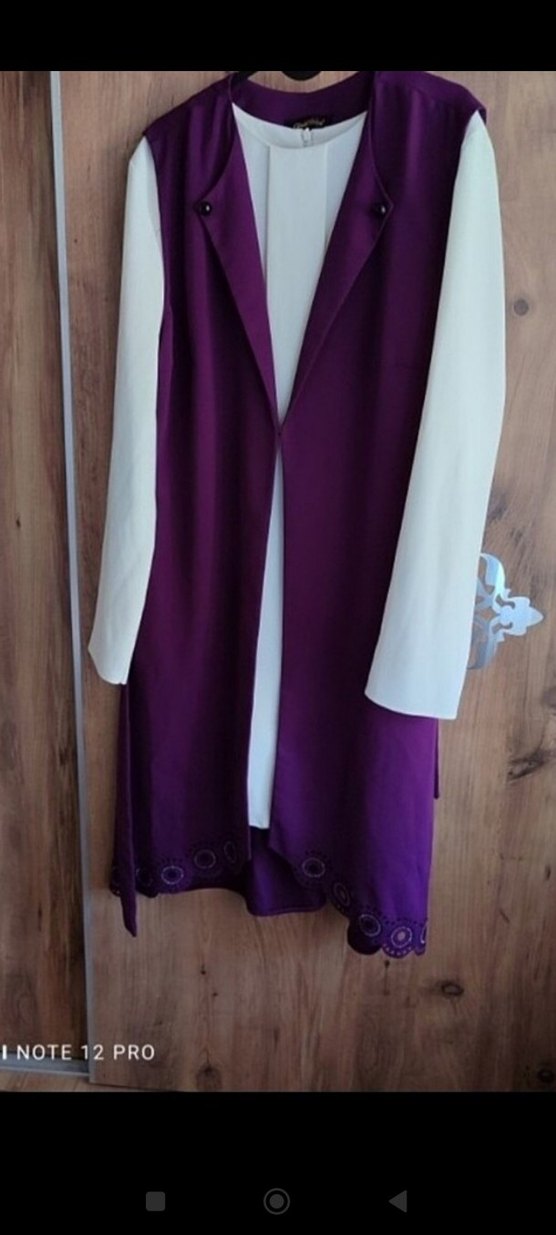 Uzun, kolsuz kadın yeleği, regular kesim ve koyu mor renkte nakış detaylarına sahiptir, minimalist goth tarzını yansıtır. abiye üçlü takım