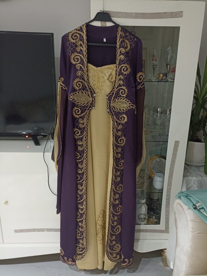 Uzun, straplez yaka ve uzun kollu bu tesettürlü bindallı, mor nakışlı detaylara sahip bol kesim bir elbisedir. Düğünler için uygundur. 1 numara s.m uyumlu bu arada tacida içinde onu cekemedim